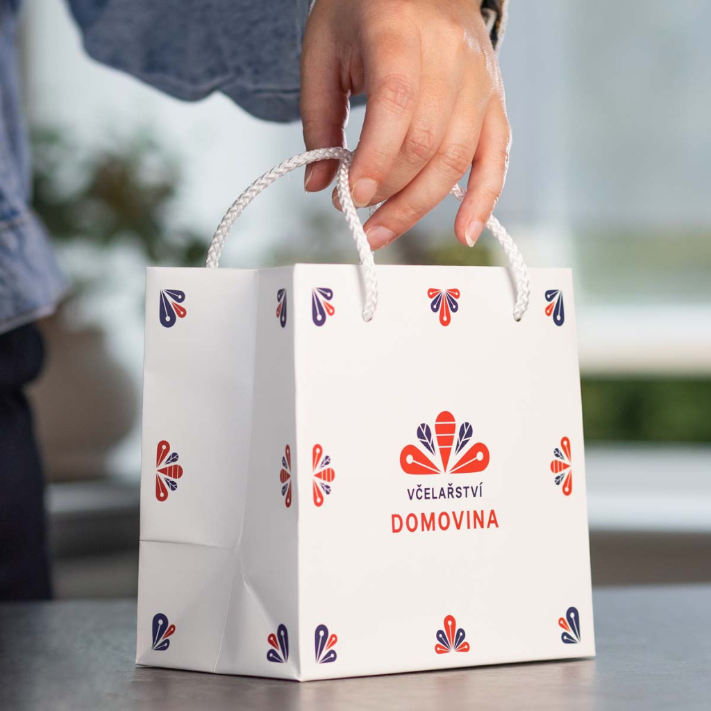 Luxusní dárková taška z Včelařství Domovina je ideální, když chcete med nebo jiné dobroty předat jako krásný dárek. Díky rozměrům 16×16×10 cm je skvělá na menší balíčky, pevná a elegantní, takže působí opravdu slavnostně.