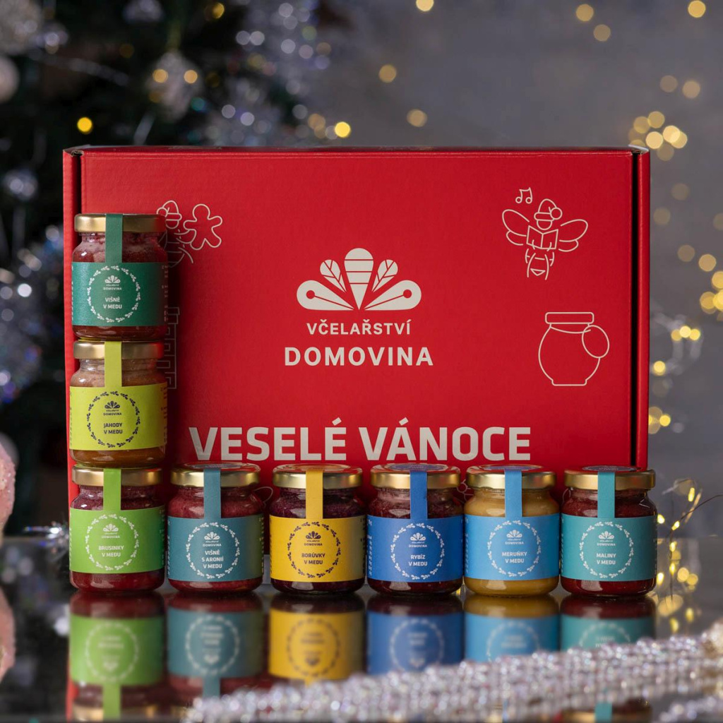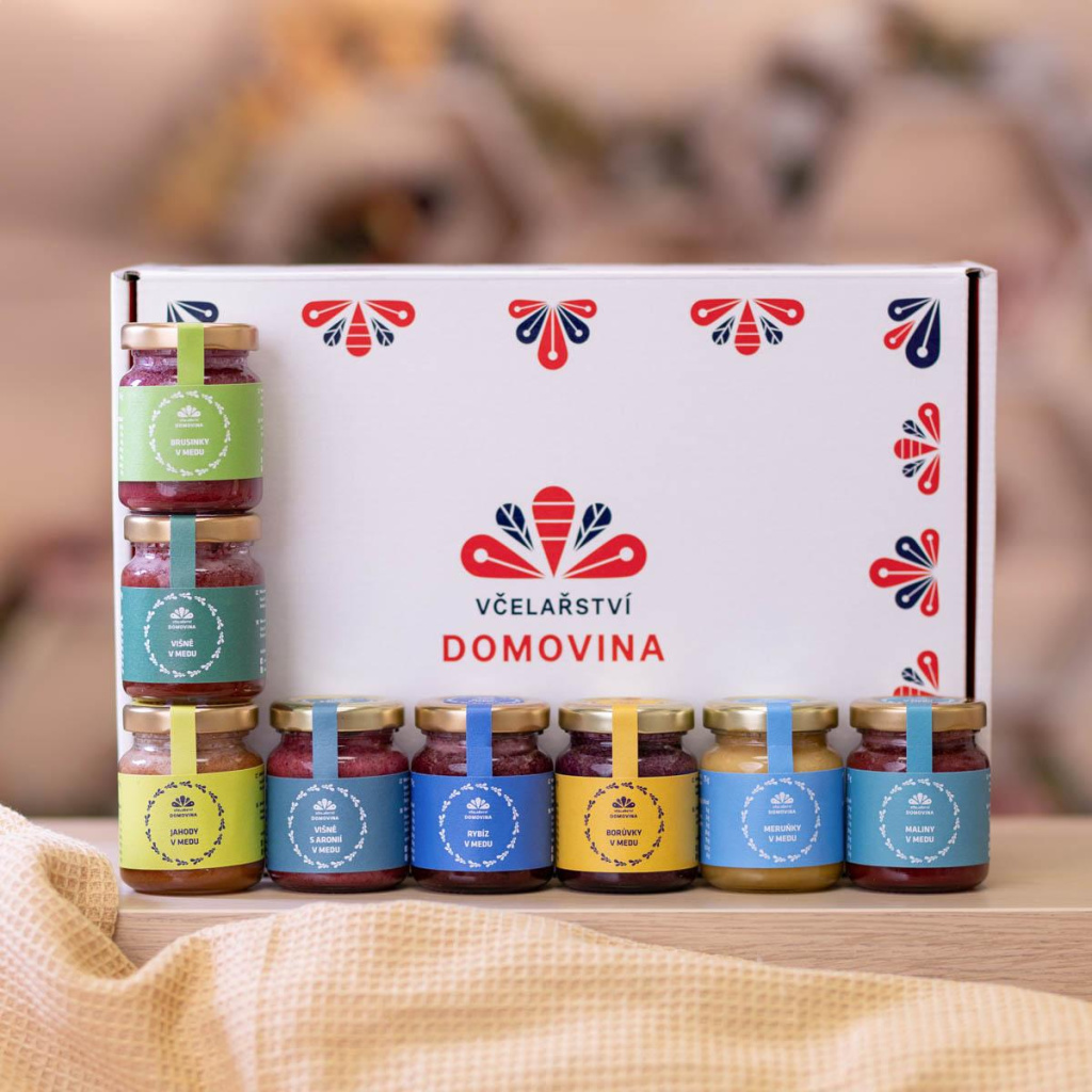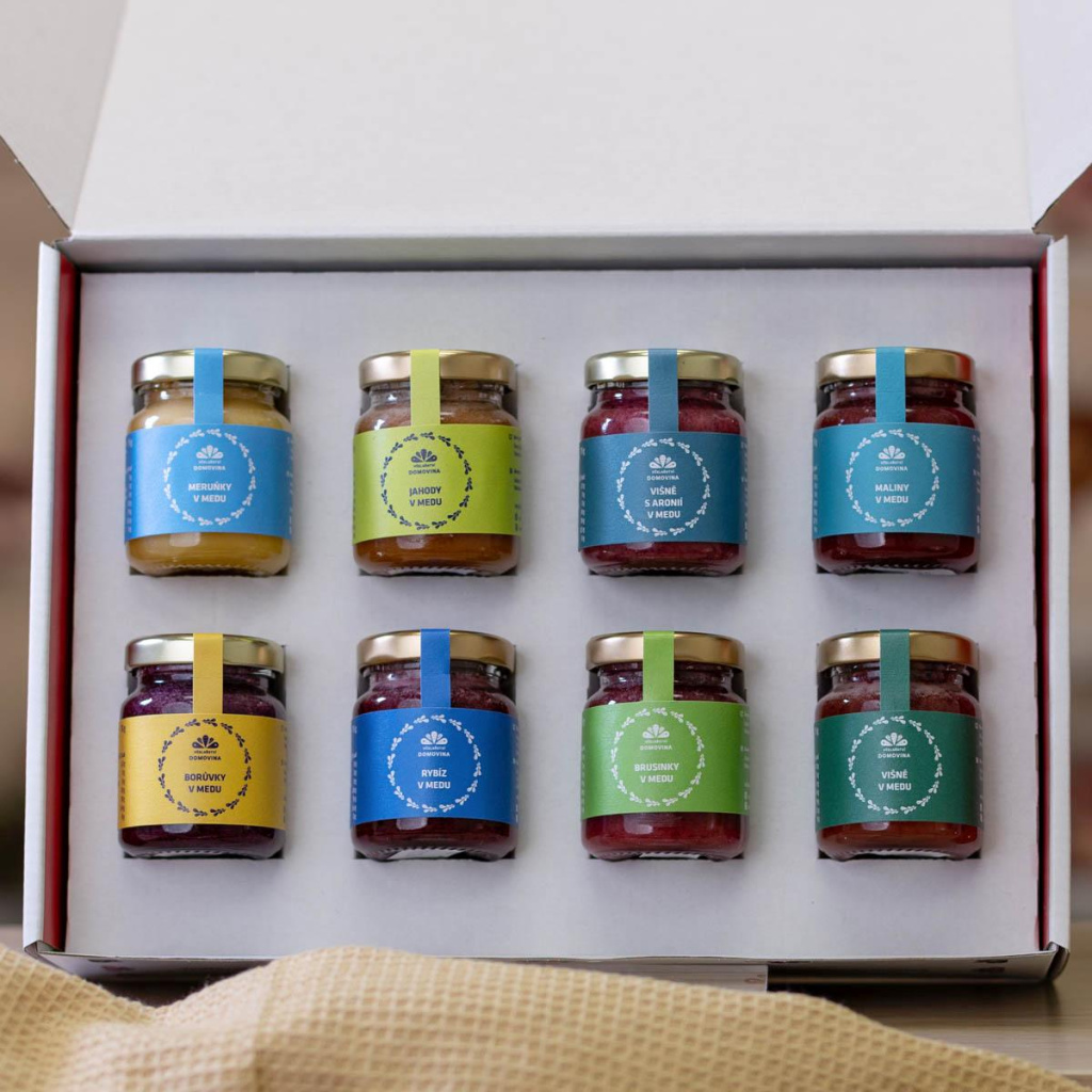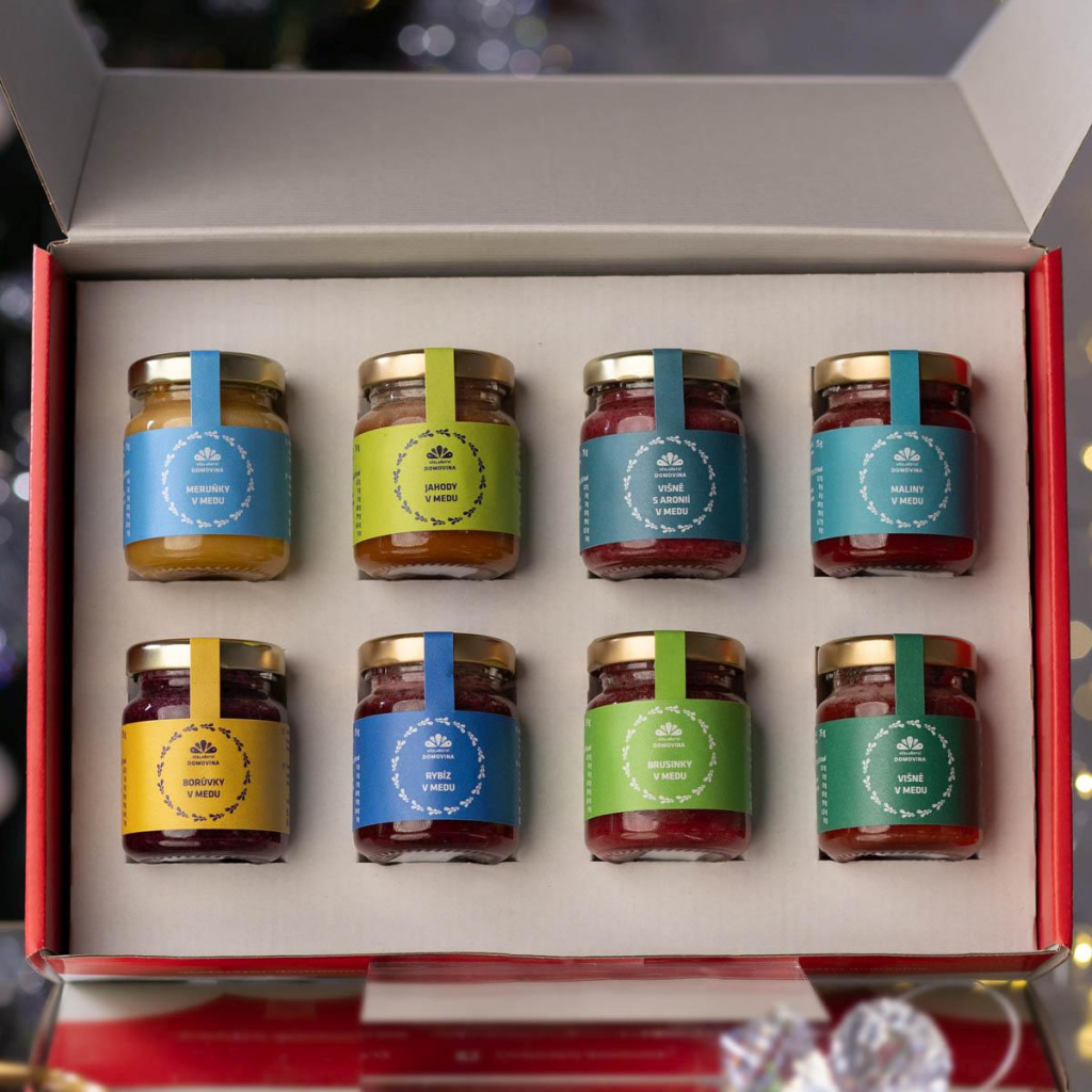 Do dárkové krabičky z papíru jsme zabalili 8 oblíbených, lahodných medů ze sady Ovocné mámení: